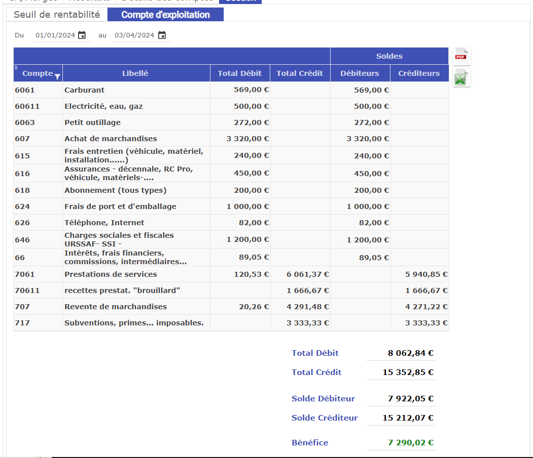 Ci-dessus : un compte de résultat fait avec notre logiciel gesticompta