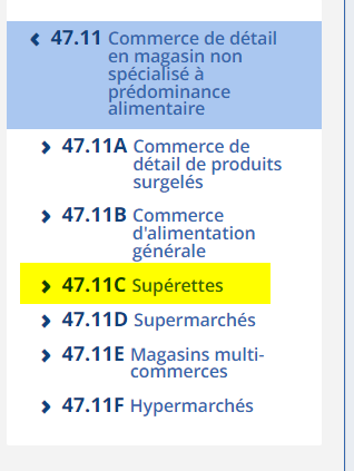 • Vous créez une supérette. Pour connaître le code APE dont dépend votre supérette, voici le cheminement à suivre :