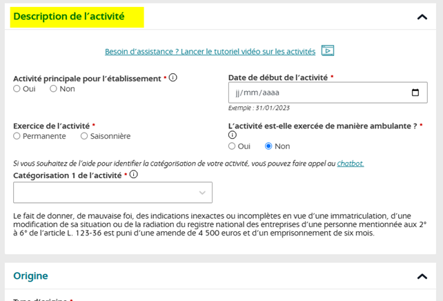 Lors de la déclaration vous avez rempli le champ concernant votre ou vos activités.